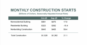 For the 12 months ending October 2025, total nonresidential starts were up 7.5% compared to the 12 months ending October 2024. Commercial starts were up 26.9%, institutional starts improved 0.2%, and manufacturing starts were down 16.3% over the same period.